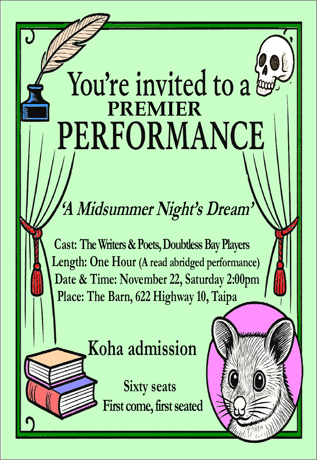 The Writers and Poets Doubtless Bay Players will perform a fun abridged version of a Midsummer Night’s Dream. All welcome. Sixty seats, so first come, first seated.